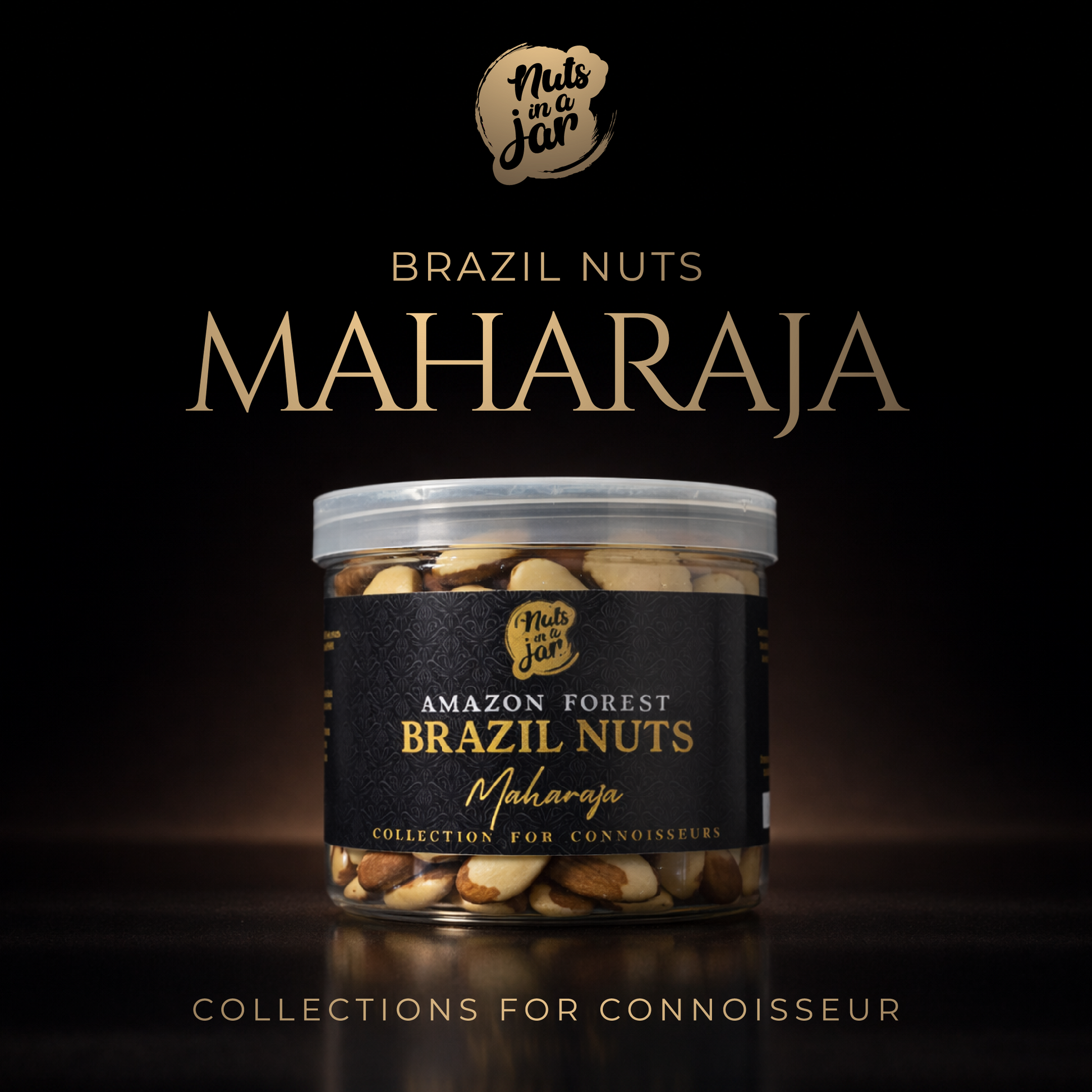 Indulge in the rare richness of Nuts in a Jar’s Maharaja Amazon Forest Brazil Nuts (250g), sourced from the pristine Amazon rainforests where some of the world’s finest Brazil nuts are naturally harvested. Celebrated for their impressive size, smooth ivory kernels, and naturally creamy texture, these whole nuts offer a bold yet refined bite. Their striking presence and luxurious character embody the distinguished elegance of the Maharaja range.